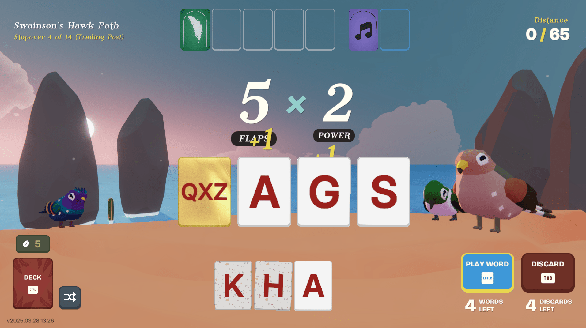 From there, you’re dealt a hand of letters and asked to build words. Each word earns you “flaps” — the game’s version of distance. Longer words get you further, and some letters are speckled (x2), gold (x5), or platinum (x10), granting you more “power” (effectively a multiplier). You can discard up to four per stopover in search of a better draw — and you’ve only got four moves per stop.